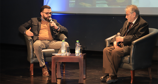 وقد حاور الدكتور إيهاب بسيسو الكاتب محمود شقير حول الكتاب والفن والتجربة مشيراً إلى أهمية مسيرة محمود شقير الإبداعية ودوره المميز في الكتابة والأدب واهتمامه بأدب الطفل على وجه الخصوص لتعزيز تماسك النية الفكرية والهوية الوطنية لدى الأجيال الفلسطينية.